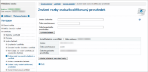 Pro zrušení vazby kvalifikovaný prostředek-žadatel je nutné v zákaznickém portálu, přihlášený jako pověřená osoba certifikátem, přejít do sekce: