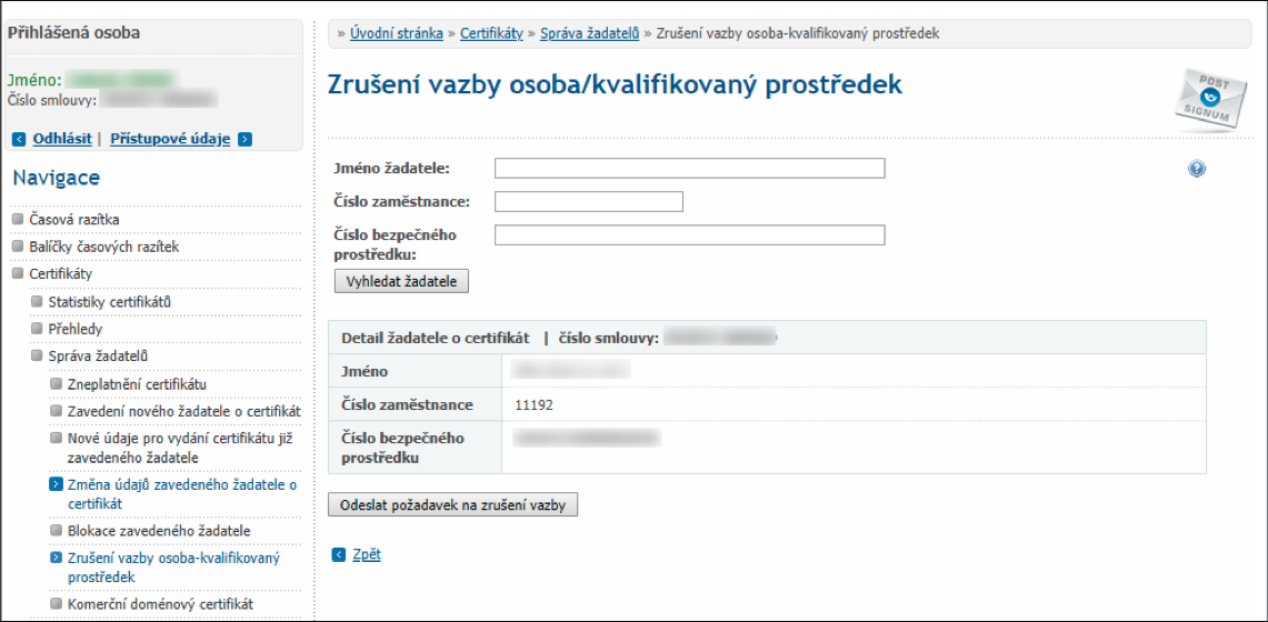 Zrušení vazby pomocí portálu PostSignum