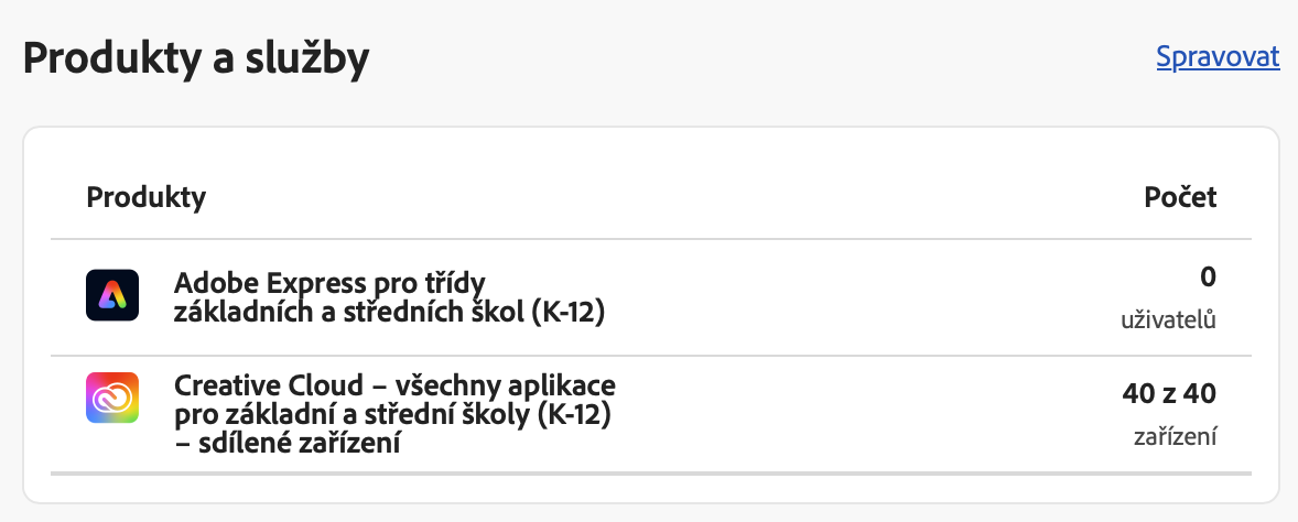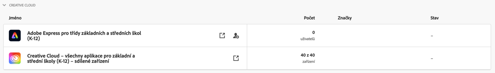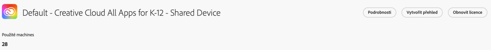 Zobrazí se přehled produktů ve službě Creative Cloud vč. počtu využitých licencí pro jednotlivé služby: