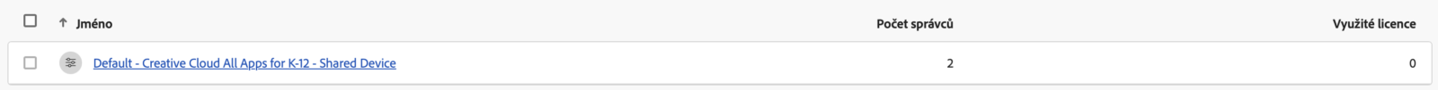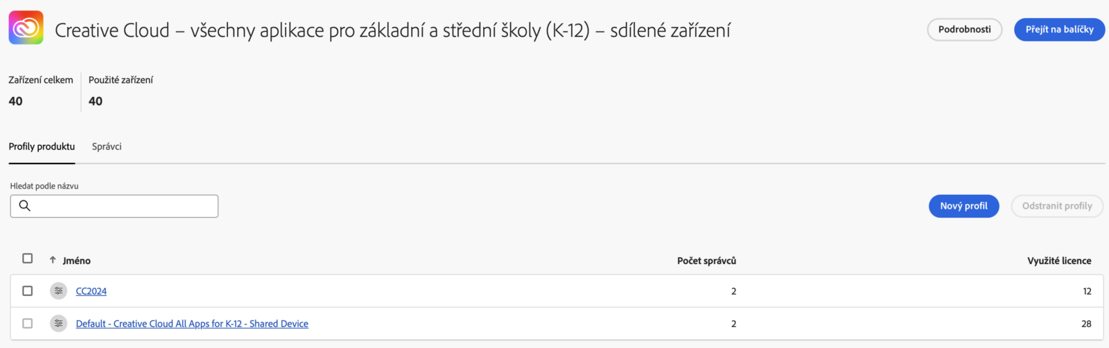 Klepněte na „Creative Coud – všechny aplikace….“, ve spodní části uvidíte vytvořené balíčky, počet využitých licencí každým z balíčků: