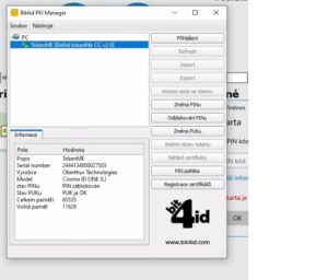Zablokovaný token po špatně zadaném PINu Pokud jste si zablokovali token špatným zadáním PINu postupujte podle následujícího návodu. Spusťte aplikaci Bit4id Klikněte na odblokování PINu, vyplňte PUK a nový PIN