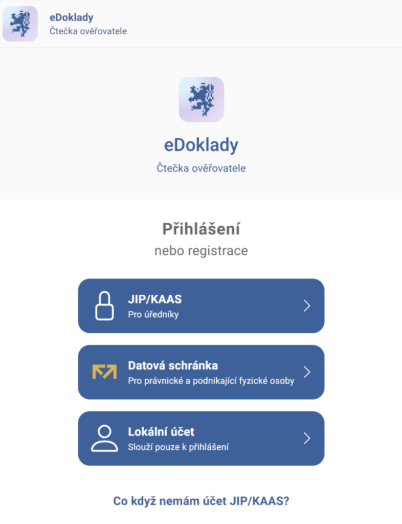 Přihlášení do webové aplikace probíhá na adrese https://ctecka.edoklady.gov.cz/prihlaseni, po kliknutí na odkaz budete přesměrováni.