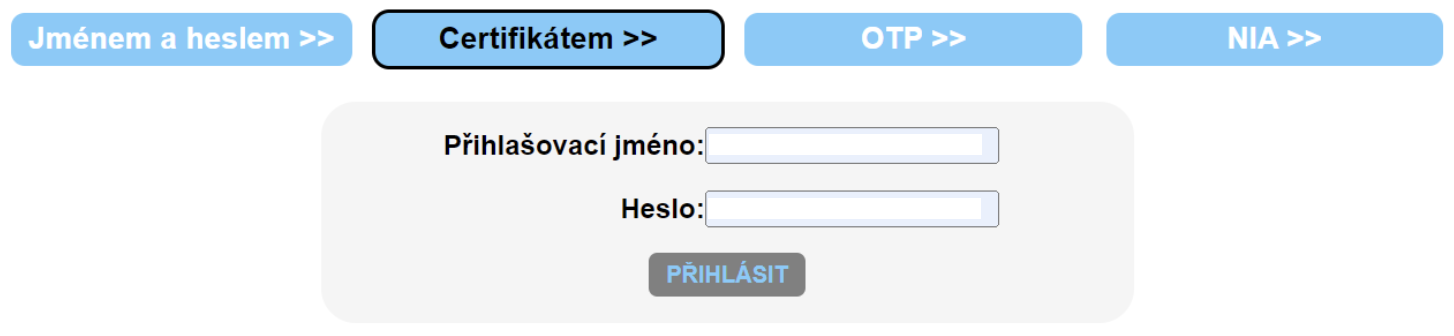 Budete přesměrováni na známý portál přihlášení do jiných služeb, např. CzechPointu. Jako obvykle pokračujete kliknutím na tlačítko [Certifikátem >>]: