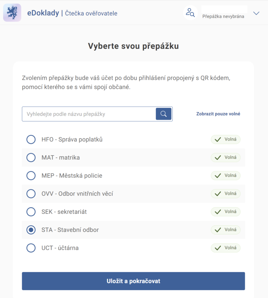 Vyberte sobě přidělenou přepážku, zobrazí se možnost výběru sady ověřovaných údajů: