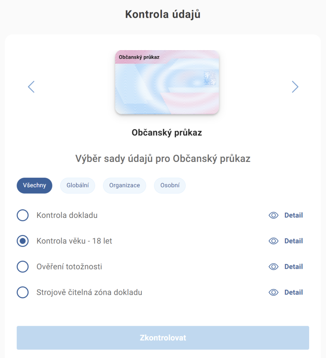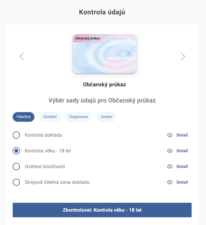 Kontrola dokladu probíhá výběrem požadované sady ověřovaných údajů, výběr sady pečlivě zvažte, nepožadujte zbytečně údaje které nejsou potřeba k provedení úkonu, např. Kontrola věku – dosažení 18 let: