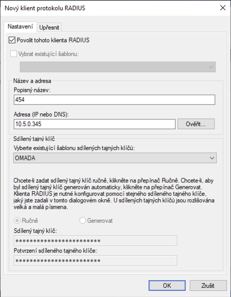 Vytvoření nového klienta v NPS serveru GUI