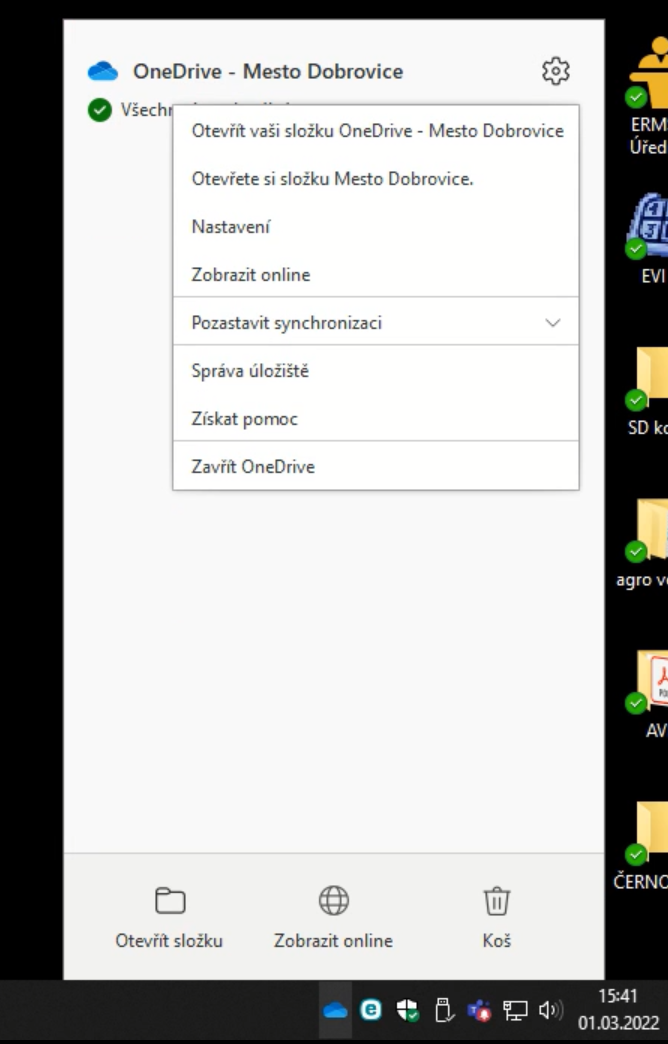 V pravém spodním rohu vedle hodin najděte ikonu aplikace OneDrive, klepněte na ním pravým tlačítkem a vyberte „Nastavení“: